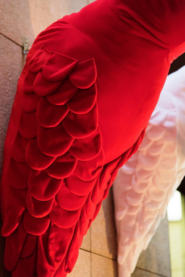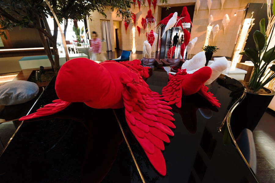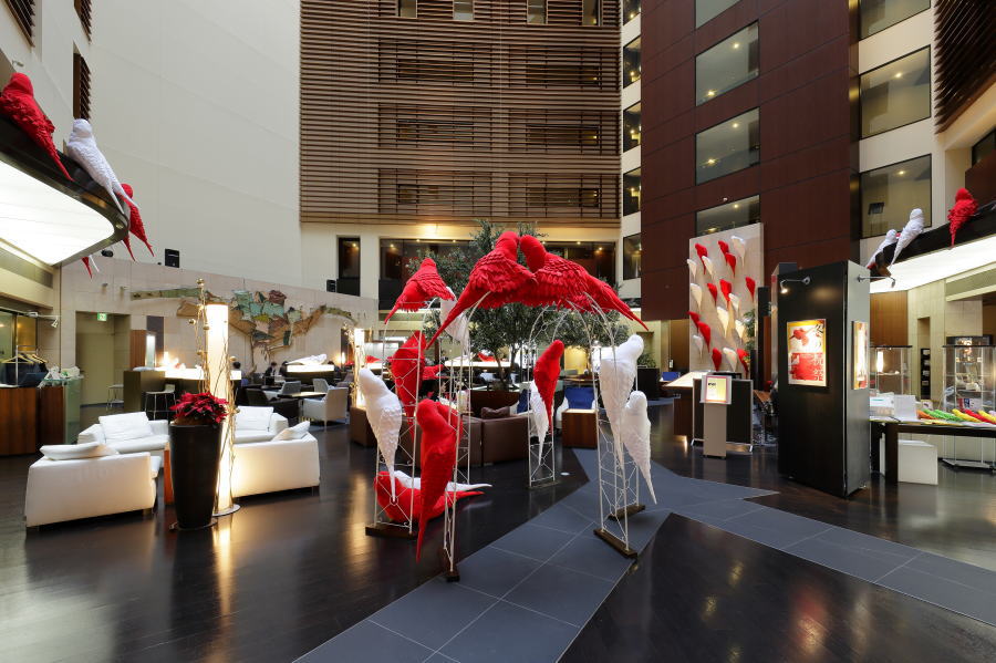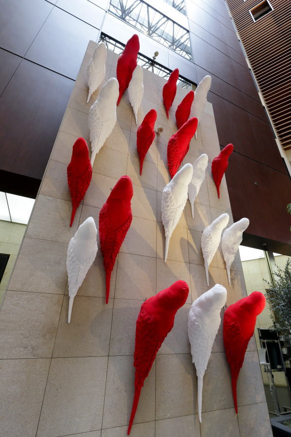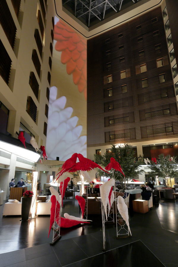 | 寒い寒い冬空から、ホテルのラウンジに舞い降りた、赤と白のインコの群れ。 インコたちの群れる姿に、日本の春を一番に告げる紅梅、白梅のほころぶ姿をかさねました。 羽をふるいたたせるさまは、まるで花びら一枚一枚が開いていくようすにもみえます。 また、赤(紅)と白の組み合わせは、古来よりお祝いごとに使われる、 とても縁起のよい色合わせでもあります。 クリスマスとお正月を迎えるこの季節、赤(紅)と白のインコから、生命に満ちたエネルギーが、 そして、インコの背中から咲いた梅の花々の隙間から、希望の光がこぼれますように。 |